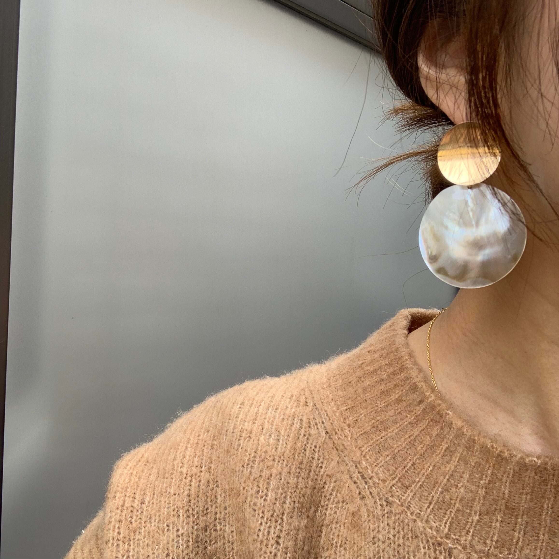 上がゴールド、下がシェルのラウンドピアスです。